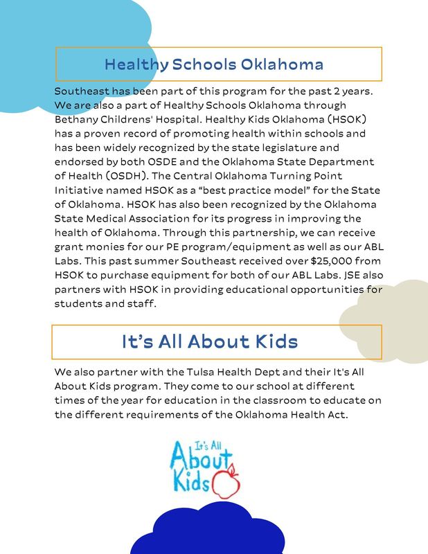 Learn about Southeast being a certified healthy school, Healthy Kids Oklahoma, our partnership with Tulsa Health Dept. and our ABL Labs.